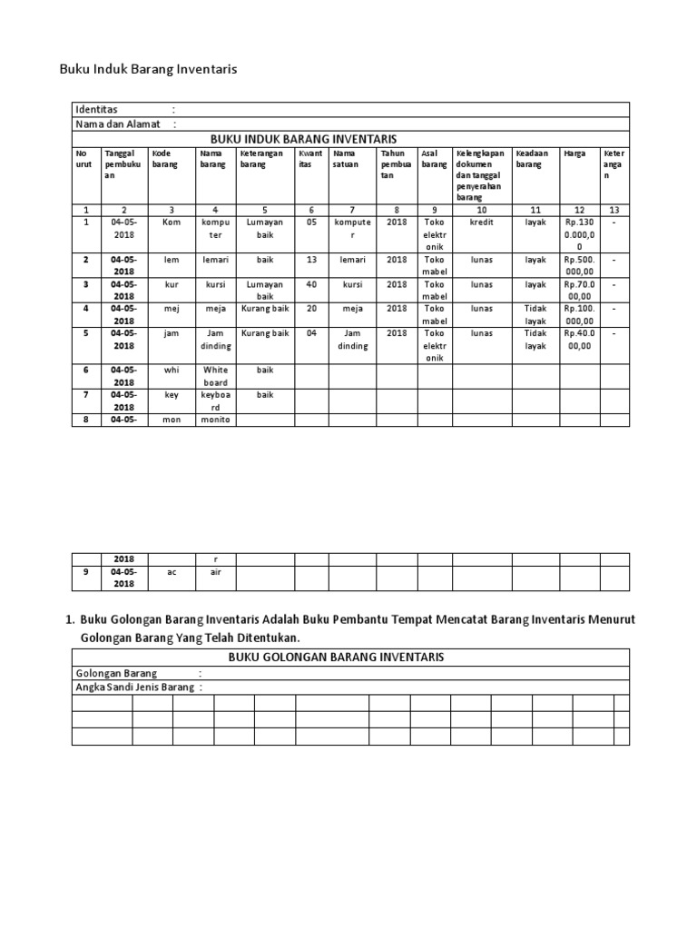 Pengisiannya dilakukan setelah pencatatan barang tersebut kedalam Buku Induk Barang InventarisBerikut contoh format buku golongan barang inventaris. Dibawah ini apa saja yang termasuk tujuan dari inventarisasi sarana dan prasaranaKecuali. Buku golongan inventaris adalah buku pembantu tempat mencatat barang inventaris menurut golongan barang yang sudah ditentukan.
