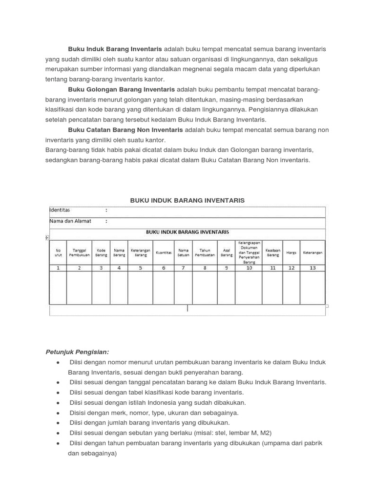 1Buku Induk Barang Inventaris adalah buku yang digunakan untuk mendatamencatat semua barang inventaris yang dimiliki suatu kantor di suatu organisasiperusahaan sehingga menjadi pusat informasi mengenai semua barang inventaris kantor tersebut. Buku inventaris aset desa adalah buku yang digunakan dalam kegiatan penatausahaan inventarisasi aset desa yang sudah ditetapkan status penggunaannya. Buku Catatan Barang Non Inventaris 9.