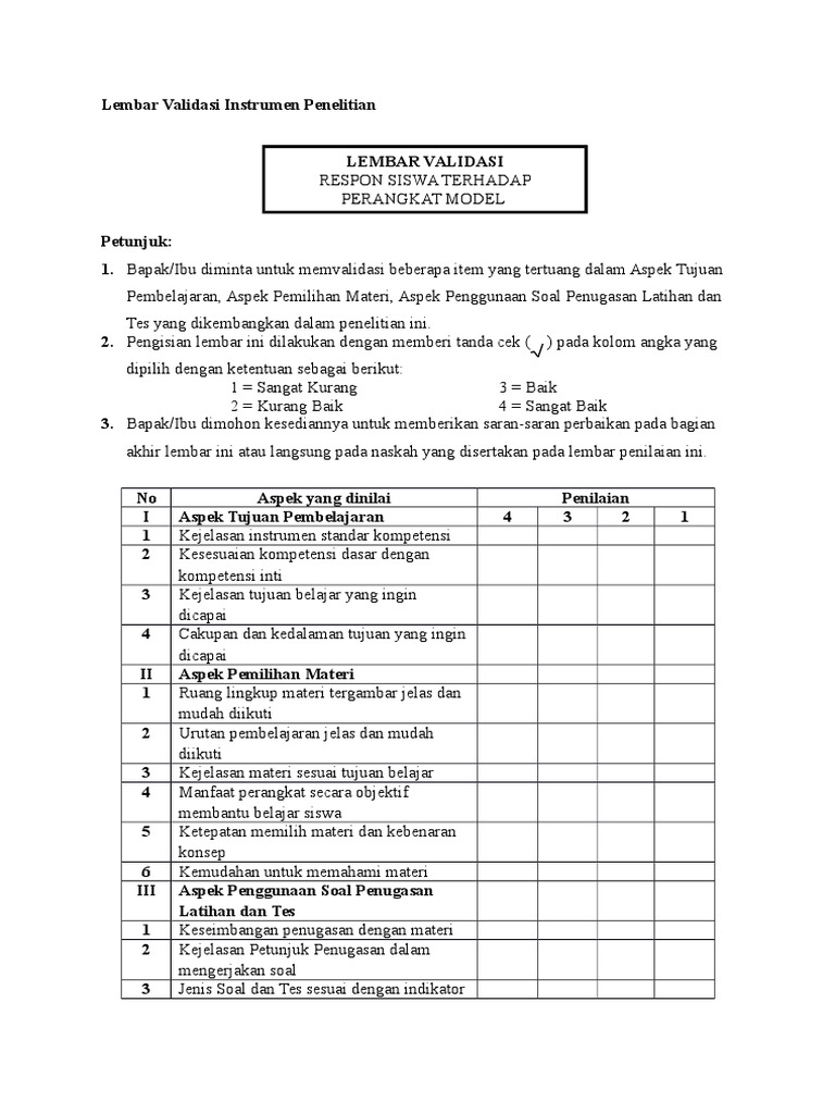 Isilah kolom validasi benkut ini. Contoh instrumenlembar validasi penelitian RnD pengembangan mobile apps lengkap Salam sejahtera untuk kita semua Instrumen penelitian merupakan alat yang digunakan untuk mencarimengetahui data dari sebuah penelitian atau sejenisnya. Instrumen Validasi untuk Ahli Media Lampiran 7.