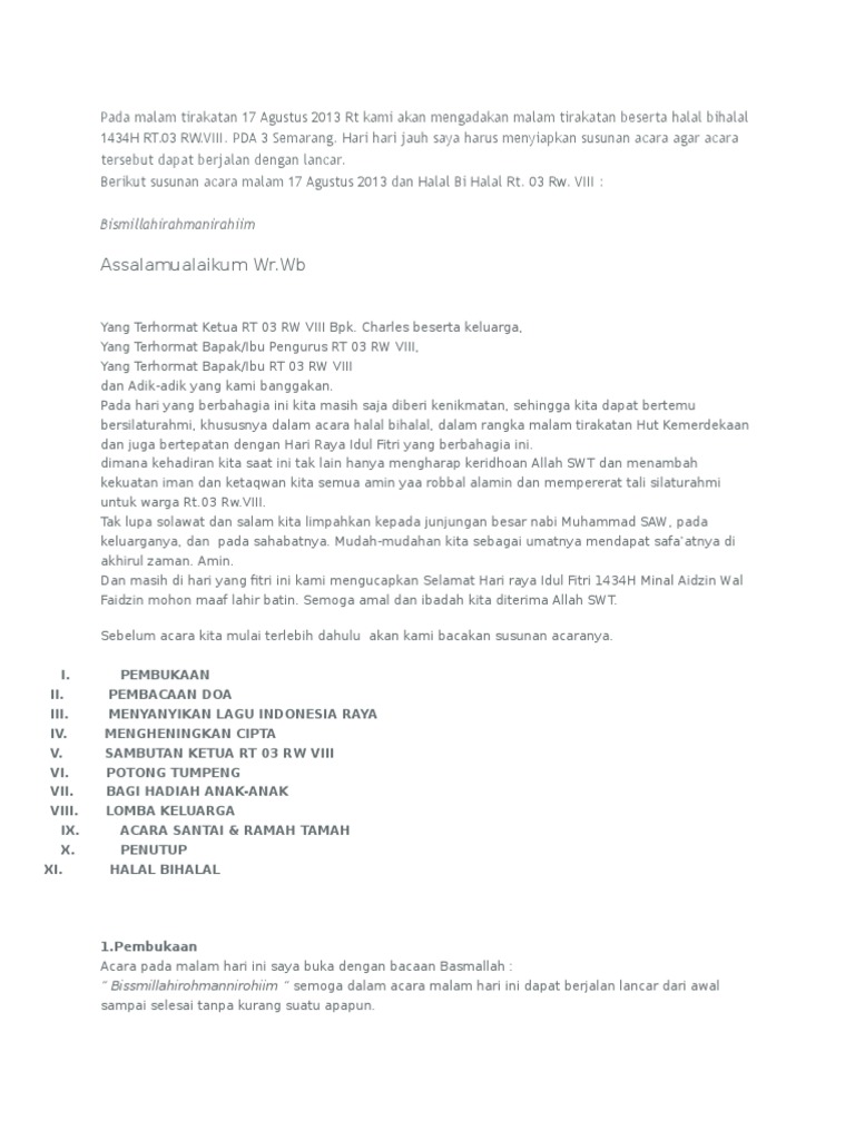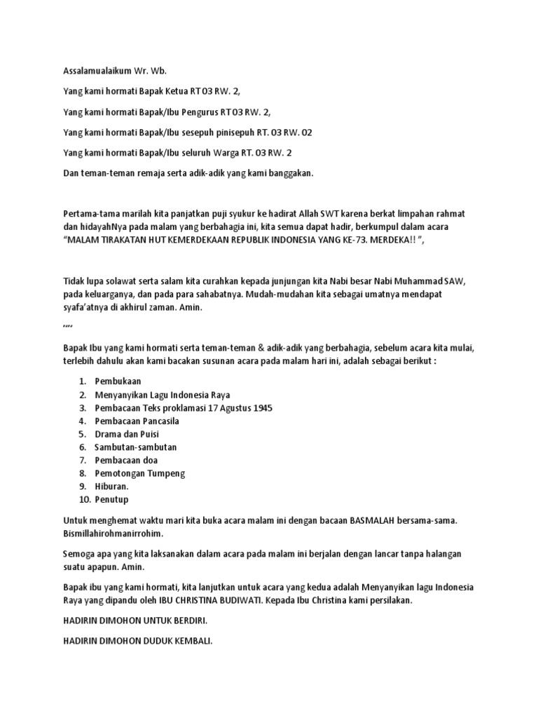 Beberapa hari yang lalu anak-anak Pradeas AedohEdo Dhita Meisya. Contoh Naskah MC Malam Tirakatan 17 Agustus tahun 2019 Menyambut Hari Ulang Tahun Kemerdekaan Republik Indonesia HUT RI ke -74 tahun 2019 sudah lazim diadakan malam tuguranmalam tirakatan. Malam sambutan 17 agustus oleh ketua rw anyar dd sambutan 17 agustus oleh ketua panitia 17 agustus 2017contoh naskah susunan acara memperingati hari ulang tahun hut republik indonesia memperingati hari lahirnya bangsa indonesia adalah acara rutin yang dilakukan oleh bangsa indonesia dari jaman.