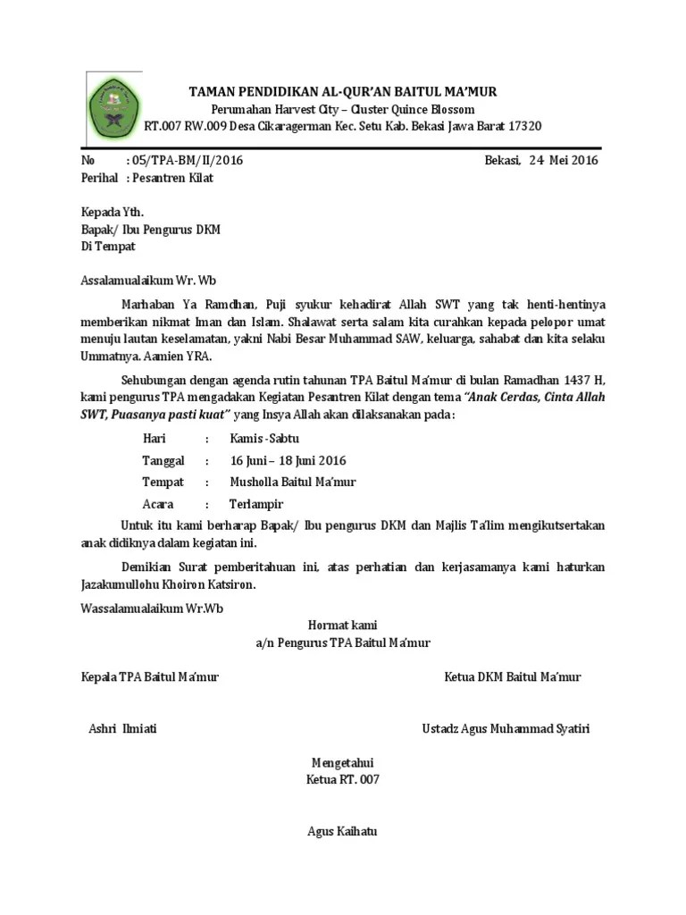 Proposal pesantren kilat adalah salah satu hal yang dibutuhkan dalam dunia pendidikan khususnya saat bulan Ramadhan tiba. Dibawah ini contoh surat undangan pengajian. KOP SURAT rata tengah.